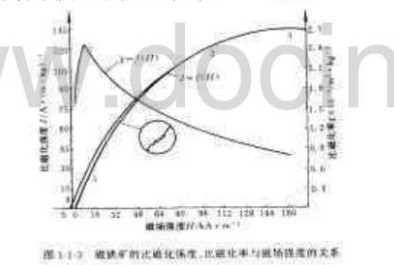 組成相同、含量相同而形狀不同的磁鐵礦的比磁化強度、比磁化率與磁場強度的關系。不同形狀的礦粒,在相同的磁場中被磁化時顯示的磁性不同。