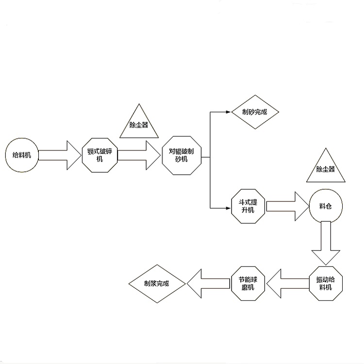 煤矸石的硬度不算太高,在使用它進行制砂時可以選擇對輥破、顎破、反擊破等組合使用,當然還需要配備一些輔助設備。近日來自山東泰安的李總需要購買煤矸石制砂制漿設備聯系到我們,根據他的需求我們為他設計了方案。我們了解到李總的煤矸石原料為200mm,經過具體分析,需要使用到的設備有給料倉、對輥制砂機、斗式提升機、料倉、振動給料機、節能球磨機各一臺,顎式破碎設備和除塵器各兩臺,具體工藝流程如下: